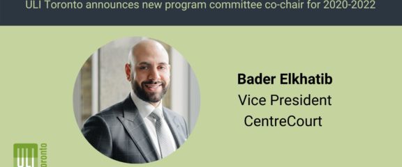Top Story ULI Toronto announces new program committee co-chair for 2020 - 2022 January 8, 2020 Bader Elkhatib, Vice President, CentreCourt Developments to join ULI Toronto’s program committee Announcement Program Committee